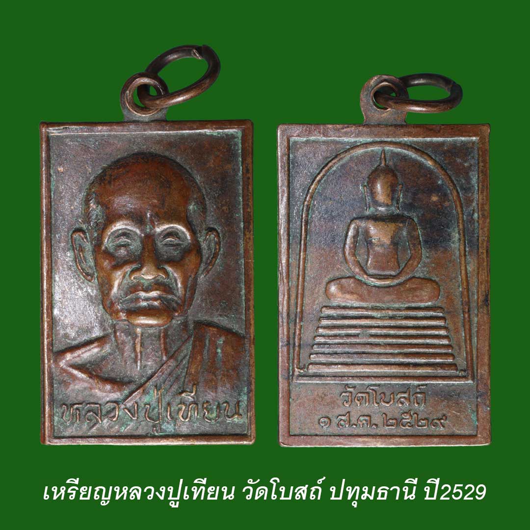 เหรียญหลวงปู่เทียน วัดโบสถ์ ปี2529 เหรียญนี้สร้างขึ้นเพื่อบูรณะวัดในขณะนั้น เหรียญนี้พุทธคุณดีเลิศทั้งทางด้านมหาอุด แคล้วคลาด และเมตตามหานิยม จัดเป็นเหรียญย้อนยุค หลวงปู่เทียน ปี2506 วัดโบสถ์ปทุมธานี ที่จัดสร้างขึ้นในคราวแรก เป็นพิมพ์เส้นขาด ส่วนคราวหลัง จะเป็นพิมพ์เส้นเต็ม